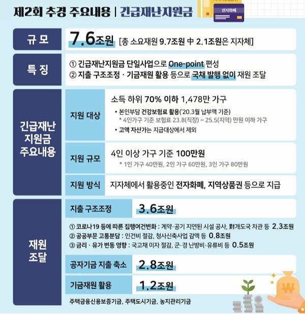 7조 6000억원에 달하는 이번 추경안은 긴급재난지원금 지급에 전액 사용된다. 긴급재난지원금 지급에는 지방비 2조 1000억원을 합쳐 모두 9조 7000억원이 투입된다.