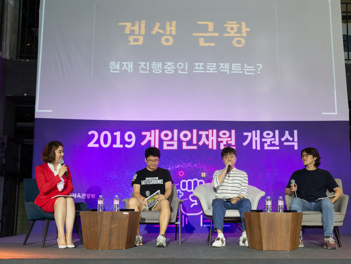 ▲26일 서울 동대문구 홍릉 콘텐츠인재캠퍼스에서 열린‘게임인재원 개원식’이 끝난 후‘게임선배 토크쇼’가 진행되고 있다. (왼쪽부터 문소리 모더레이터, 펍지 임성진 게임디자이너, 유다엘 ㈜다에리소프트 대표, 박성필 스튜디오냅 대표) |