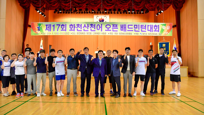 [로컬세계=전경해 기자] 제17회 화천 산천어 전국 오픈 배드민턴 대회 개회식이 10일 화천체육관에서 최문순 군수, 박대현 도의원, 류희상 군의장, 안승국 군배드민턴협회장 등이 참석한 가운데 열렸다. 11일까지 열리는 이번 대회에는 전국에서 1,600여명의 동호인이 참가하고 있다.(사진=화천군 제공)