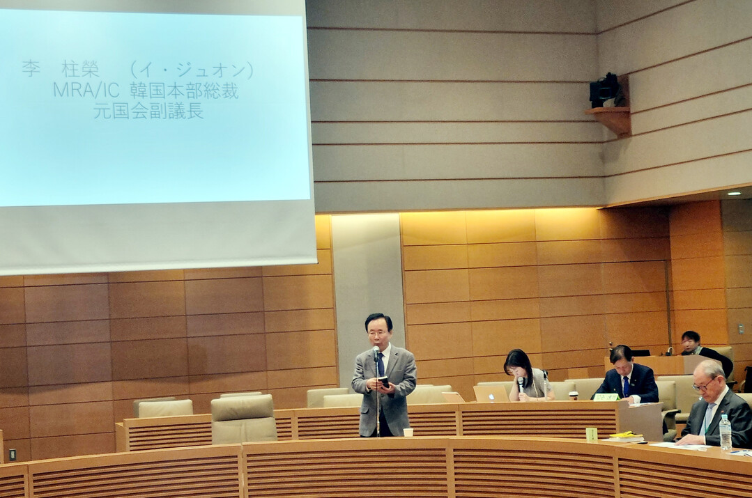세계도덕재무장(MRA/IC) 한국본부 이주영 총재는 지난 27일 일본 국회 중의원 제1의원회관 국제회의실에서 개최된 국제MRA/IC일본협회의 창립 50주년 기념행사에 참석해 축하했다. 이주영 총재 연설 모습