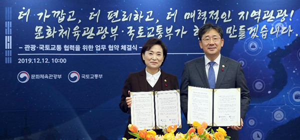 문체부와 국토부는 12일 문체부 대회의실에서 내외국인 관광을 통한 지역경제 활성화를 위해 ‘관광-국토교통 협력을 위한 업무협약’을 체결했다.