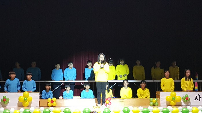 ▲24일 열린 삼척예술제의 마지막 공연 '리듬을 타요! 컵타' 공연을 펼치기전 정수임 학생대표가 작품에 대해 설명을 하고 있다.(지도교사=김춘자) |