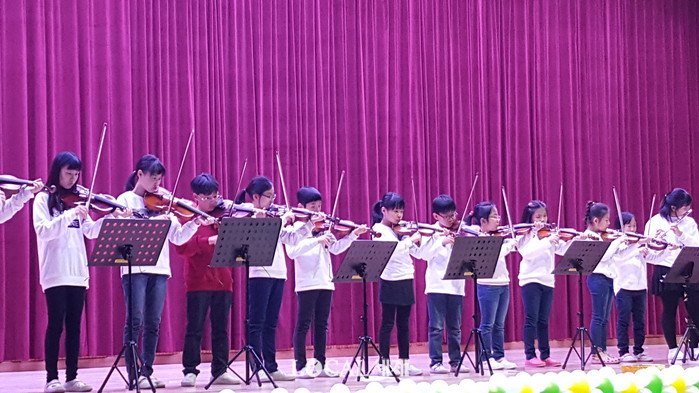 ▲24일 열린 삼척예술제에서 방과 후에 익힌 바이올린, 플롯 악기로 에델바이스 ,하늘나라동화 곡을 선보이고 있다.(지도교사=최혜리) |