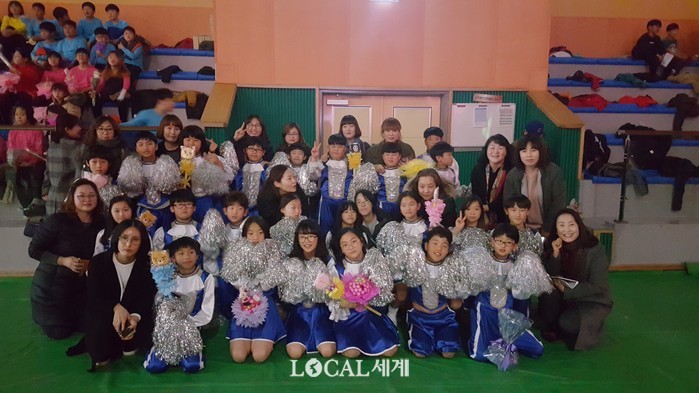 ▲치어댄스 공연을 마친 4학년 3반 김인자 지도교사(맨앞줄 오른쪽)와 학생들이 학부모들과 함께 포즈를 취하며 기념촬영을 하고 있다. |
