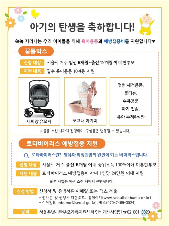 ‘로타바이러스 예방 접종비’는 서울 거주 출산 6개월 이내의 기준 중위소득 100% 이하 미혼한부모가정이 대상이다. 예산이 소진될 때까지 진행한다.
