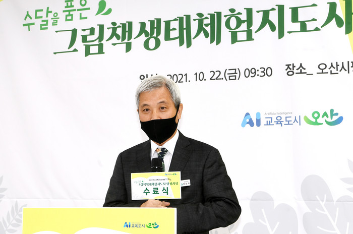 | ▲오상욱 시장이 22일 ‘수달을 품은 그림책 생태체험지도사 양성과정’ 수료식에서 인사말을 하고 있다. 오산시 제공 |