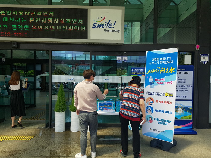 구는 앞서 19일 금정구청, 동 행정복지센터 16개소, 금정체육센터, 금정도서관, 작은도서관 16개소 등 기관을 방문하는 구민 누구나 자유롭게 가져갈 수 있도록 시원한 금정수(水) 2300병을 비치했다.