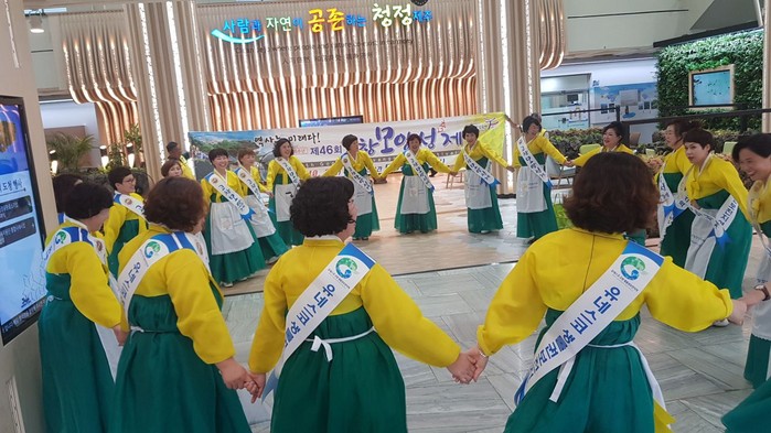 참가자들은 제주도청 앞에서 노란 한복을 곱게 차려입고 강강술래를 재연하며 한반도 첫수도 고창군과 마흔여섯 번째를 맞은 모양성제를 알렸다.