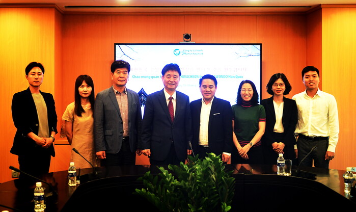 ▲최문순 군수(왼쪽에서 네번째) 등 화천군 홍보단이 베트남 '하노이 투어리스트' 본사를 방문해 기념촬영을 하고 있다. |