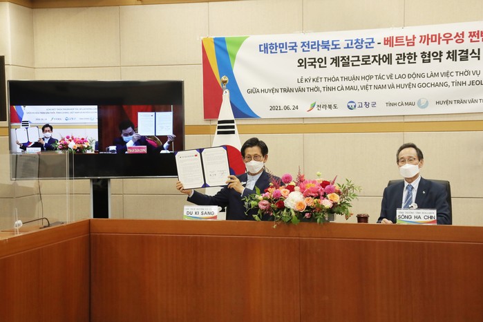 25일 고창군에 따르면 전날 오후 전북도청 영상회의실에서 농촌 인력 부족 완화를 위해 베트남 쩐반터이군과 화상으로 ‘외국인 계절근로자 도입을 위한 업무협약’을 체결했다.