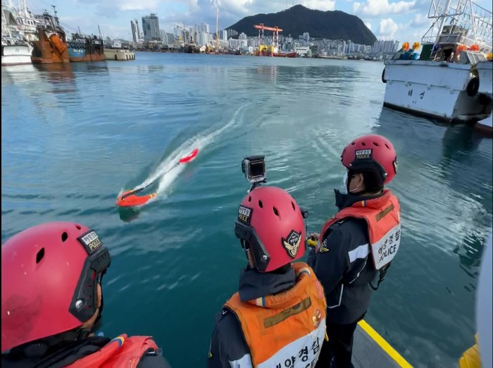 ▲남항해경파출소에서 인명구조용 무선조종 구명환을 시범운용하고 있다. 부산해양경찰서 제공 |