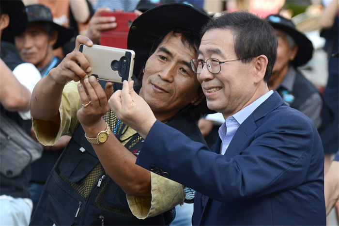 ▲2017년 2기 희망아카데미 졸업생이 박원순시장과 함께 사진을 찍는 모습.(서울시 제공) |