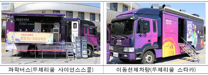 또한 이동 과학관에서는 중력·무게변화 체험 등 과학전시 및 과학공연 프로그램을 제공하는 과학버스와 망원경·태양관측카드 등 천체장비를 활용한 천문관측 프로그램을 제공하는 이동 천체차량을 운영한다.