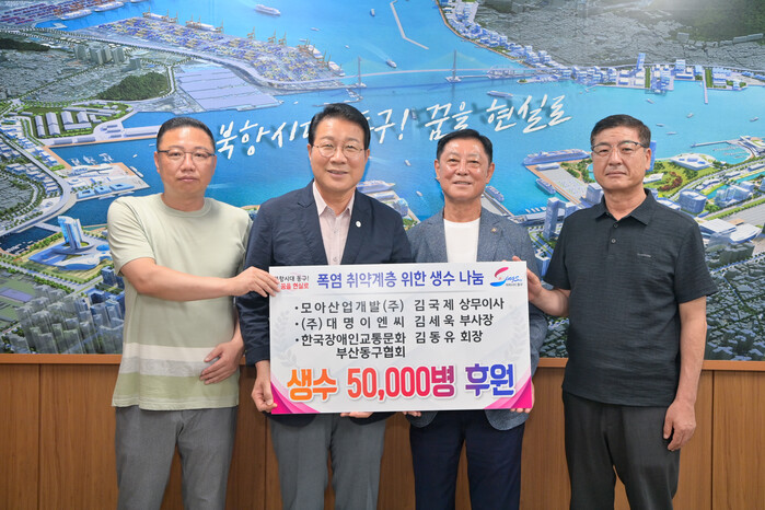 [로컬세계 부산=맹화찬 기자]부산광역시 동구는 6일 후원자들로부터 여름철 폭염취약계층의 온열질환 예방을 위한 생수 500㎖짜리 5만병을 후원 받았다고 밝혔다.