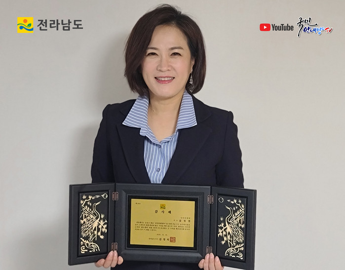 ▲가수 김정연씨가 전남도로부터 감사패를 전달 받았다.(전남도 제공) |