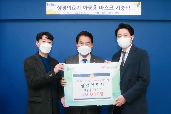 [로컬세계 김병민 기자]경기 용인시 아이들의 코로나19 예방과 안전을 위해 성경의료기가 6일 용인시자원봉사센터에 1500만원 상당의 아동용 마스크 5만장을 기탁했다.