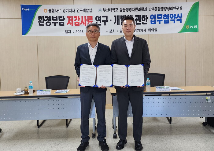 농협사료(대표이사 김경수) 연구개발실은 지난 18일 부산대학교 동물자원과학과 반추동물영양생리학실과 환경부담저감사료 연구·개발에 관한 업무협약을 체결했다고 밝혔다.