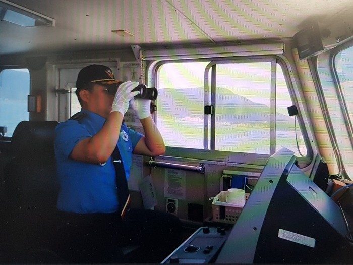 | ▲부산해양경찰서장[총경 이광진] 이 제5호 태풍[장미]이 지나간 부산앞바다를 순시하고 있다. |