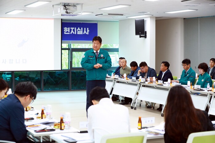▲ 이상호 태백시장이 고용위기지역 지정 신청을 위해 고용노동부 현지실사단에 현 상황을 설명하고 있다. 태백시 제공 |