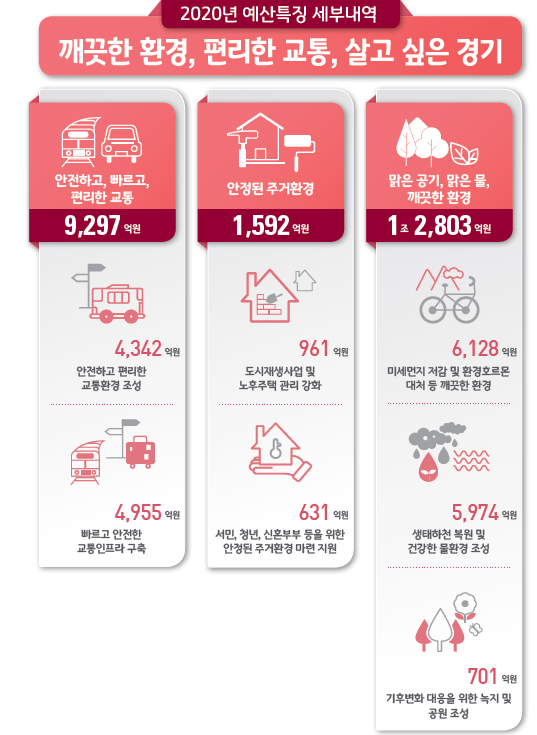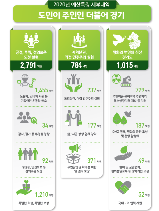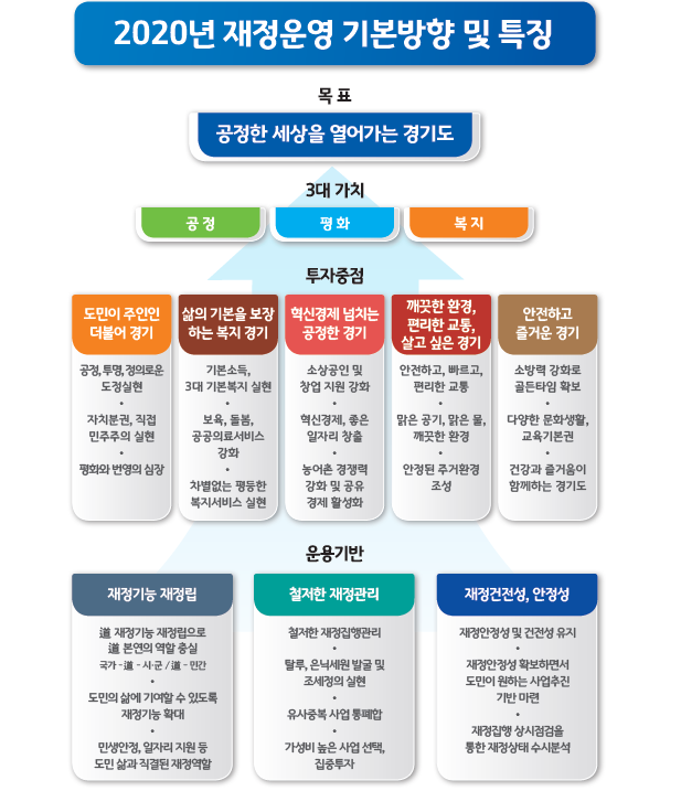 2020년 예산에는 ‘공정한 세상을 열어가는 경기도’를 최우선 목표로 ‘5대 분야’에 중점 투자함으로써 민선 7기 도정 3대 핵심가치인 ‘공정, 평화, 복지’를 실현해 나가겠다는 구상이다.