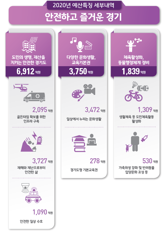 먼저, 응급의료전용 24시간 닥터헬기 등과 같이 도민의 생명과 재산을 지키는 안전한 경기도를 조성하는 부문에는 6912억원, 문화와 교육기본권을 위한 분야에는 3750억원, 체육활성화와 아프리카돼지열병 등 가축 위생을 강화하는 분야에는 1839억원을 투입하기로 했다.