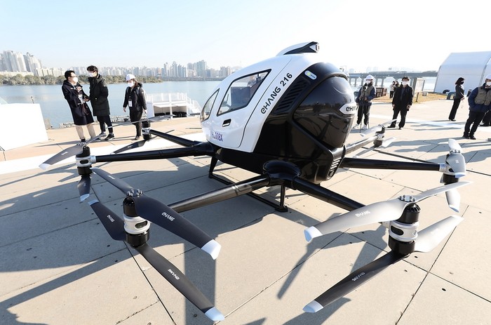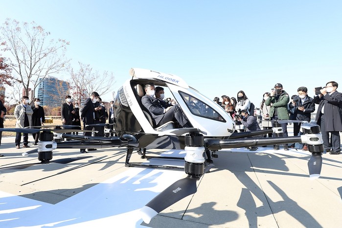 11일 오전 서울 여의도 한강시민공원에서 서울시와 국토교통부 주최로 열린 ‘도시, 하늘을 열다’ 도심항공교통 서울실증 행사에서 미래 교통수단인 ‘유인용 드론택시’ 시범비행이 진행되고 있다. 사람이 탈 수 있는 드론택시 기체가 실제로 국내에서 하늘을 나는 것은 이번이 처음이며 시범비행에 사용된 드론택시는 중국 드론 전문업체 이항이 개발한 2인승 드론택시(EH216)이다.(사진=국토교통부 제공)