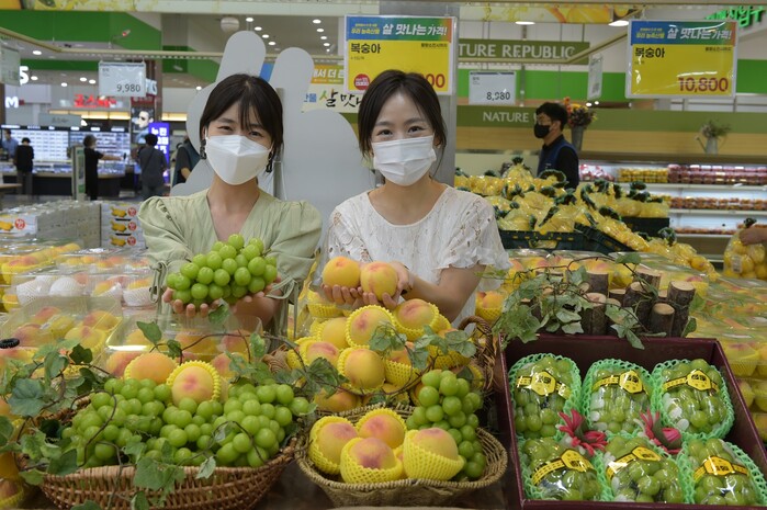 | ▲26일(일) 서울 서초구에 위치한 하나로마트 양재점에서 모델들이 올해 처음으로 선보이는 샤인머스캣(평균 당도 16Brix 이상)과 그린황도(평균 당도 13Brix 이상)를 선보였다. 농협유통 제공 |