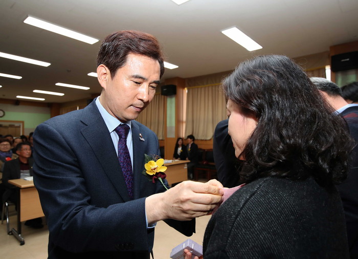 | ▲그린농업기술대학(원) 입학생들에게 대학교 배지를 달아주고 있는 서철모 화성시장.(화성시 제공) |