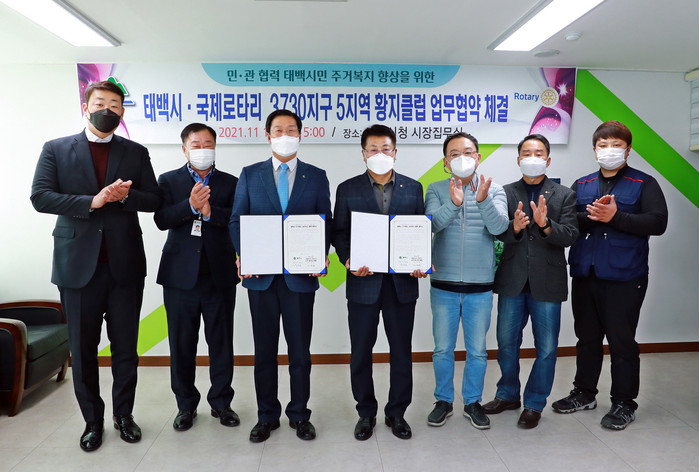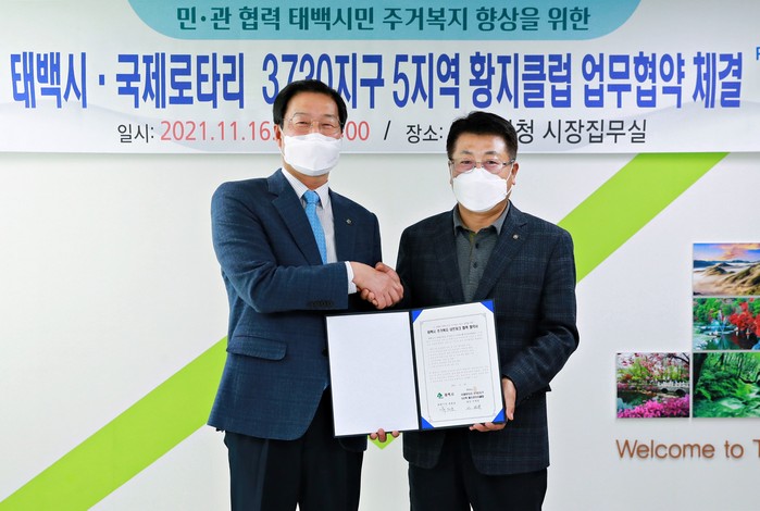 [로컬세계 박상진 기자]강원 태백시는 16일 국제로타리3730지구 5지역 황지로타리 클럽과 태백시민의 주거복지향상 실현을 위한 업무협약(MOU)을 체결했다.