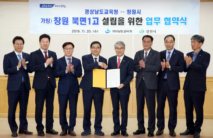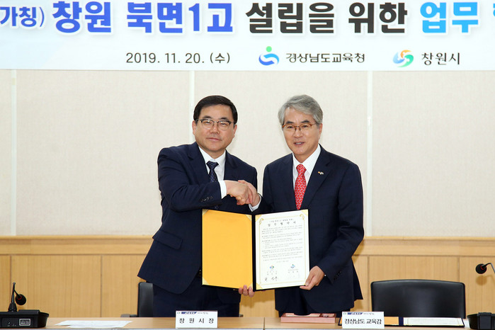 이날 허성무 창원시장은 박종훈 경상남도교육감과 창원시청 제3회의실에서 창원시 북면 일원에 ‘(가칭)북면1고’ 설립을 위한 협약식을 가졌다. 이들은 예산지원 등 상호 협력을 통해 고등학교 설립을 적극 추진키로 했다.