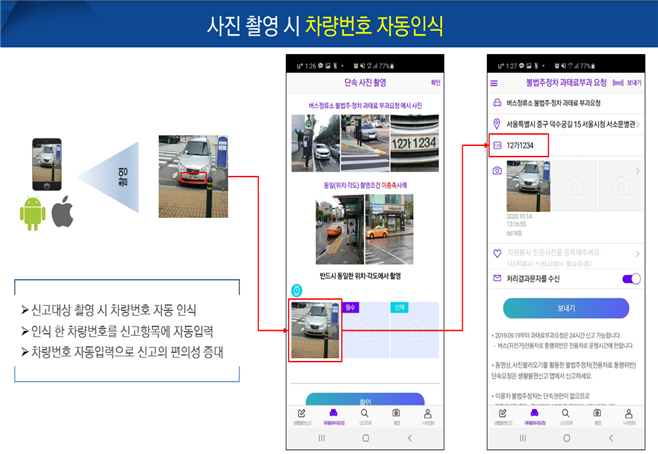 그동안 신고자가 차량번호를 일일이 수기로 입력했다면, 이제는 앱을 켜고 사진만 찍으면 사진 속 번호판 숫자를 자동으로 인식한다. 서울시는 이미지 파일 속 문자를 텍스트로 자동 변환하는 ‘OCR문자인식’ 기술을 활용해 앱에 자동차 번호판 자동 인식 기능을 탑재했다.