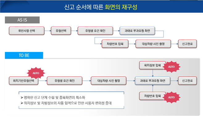 기존에 불법 주정차 신고를 위해선 6단계(위반사항 선택 → 유형 선택 → 선택한 유형 신고요건 확인 → 차량번호 입력 → 단속 사진 촬영 → 보내기)의 절차를 거쳐야만 했다.