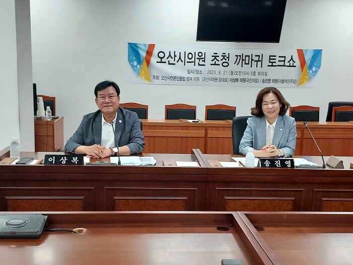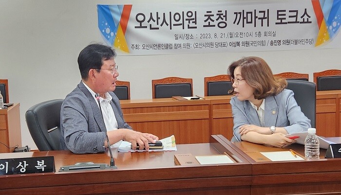 ▲ 오산시언론인클럽 주최로 오산시의회 5층 회의실에서 이상복의원(국힘) 송진영의원(더민주) 초청 '까마귀 토크쇼'가 진행되고 있다. 사진=김병민 기자 |