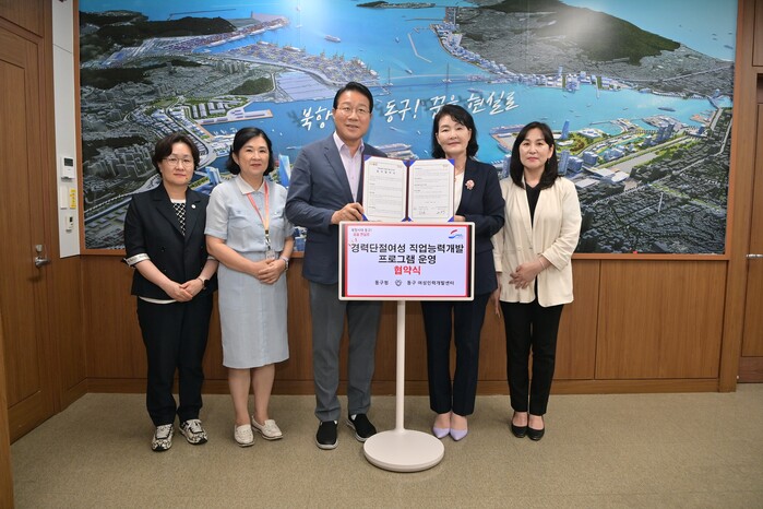 [로컬세계 부산=맹화찬 기자]부산시 동구는 지난 5일 동구 여성인력개발센터와 경력단절여성 직업능력개발 프로그램 운영을 위한 업무협약을 체결했다.