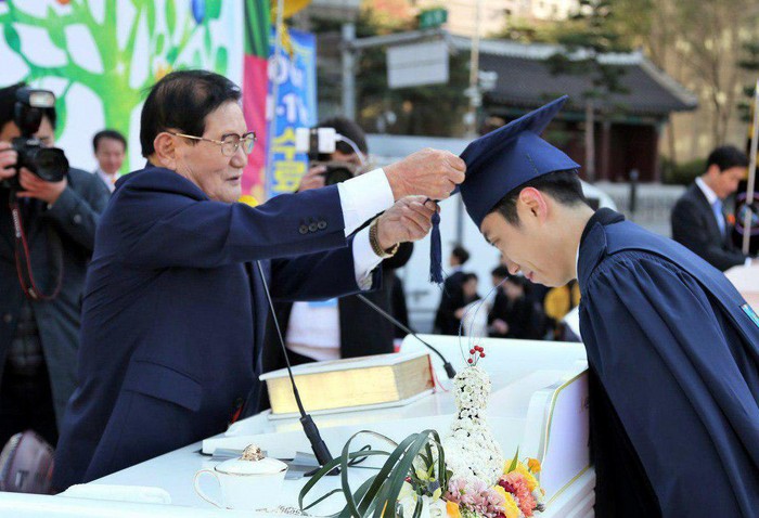 ▲19일 서울광장에서 열린 106기 9반‧11반 수료식에서 이만희 총회장이 수료생의 수술을 넘겨주고 있다. |