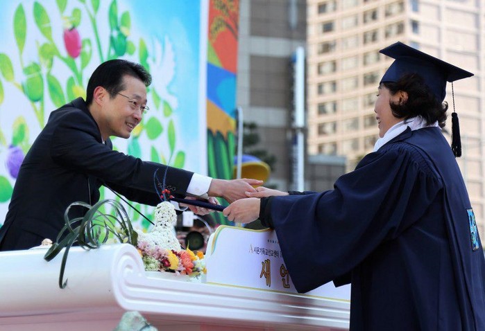 ▲19일 서울광장에서 열린 106기 9반‧11반 수료식에서 시온기독교선교센터 탄영진 총원장이 수료증을 건네며 악수하고 있다. |