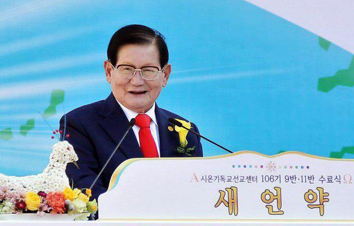 ▲19일 서울광장에서 열린 106기 9반‧11반 수료식에서 이만희 총회장이 설교하고 있다.(서울야고보 제공) |