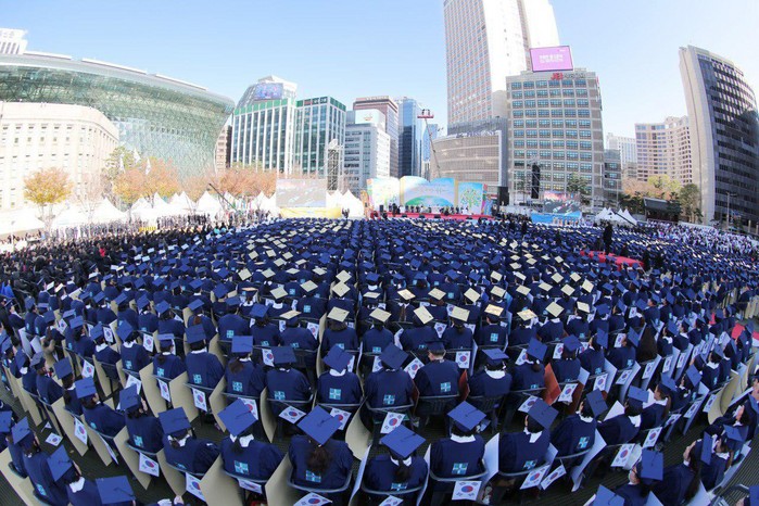 ▲19일 서울광장에서 열린 106기 9반‧11반 수료식에서 수료생들이 이만희 총회장의 설교말씀을 경청하고 있다. |