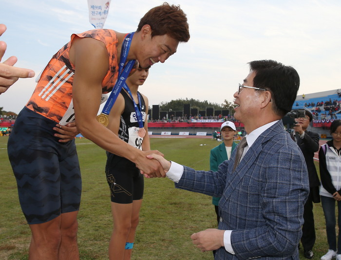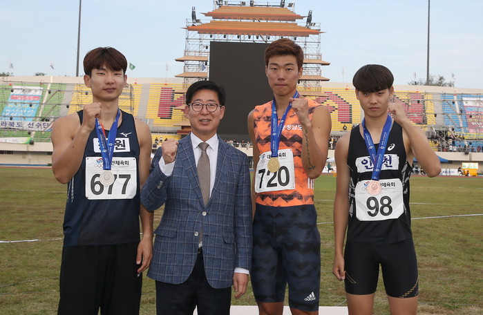 [로컬세계 최홍삼 기자]14일 전북 익산종합운동장에서 열린 제99회 전국체육대회 육상 남자 400m 결선에서 1위를 차지한 충남 소속(서천군청) 이재하 선수에게 양승조 지사가 금메달을 수여하고 있다.