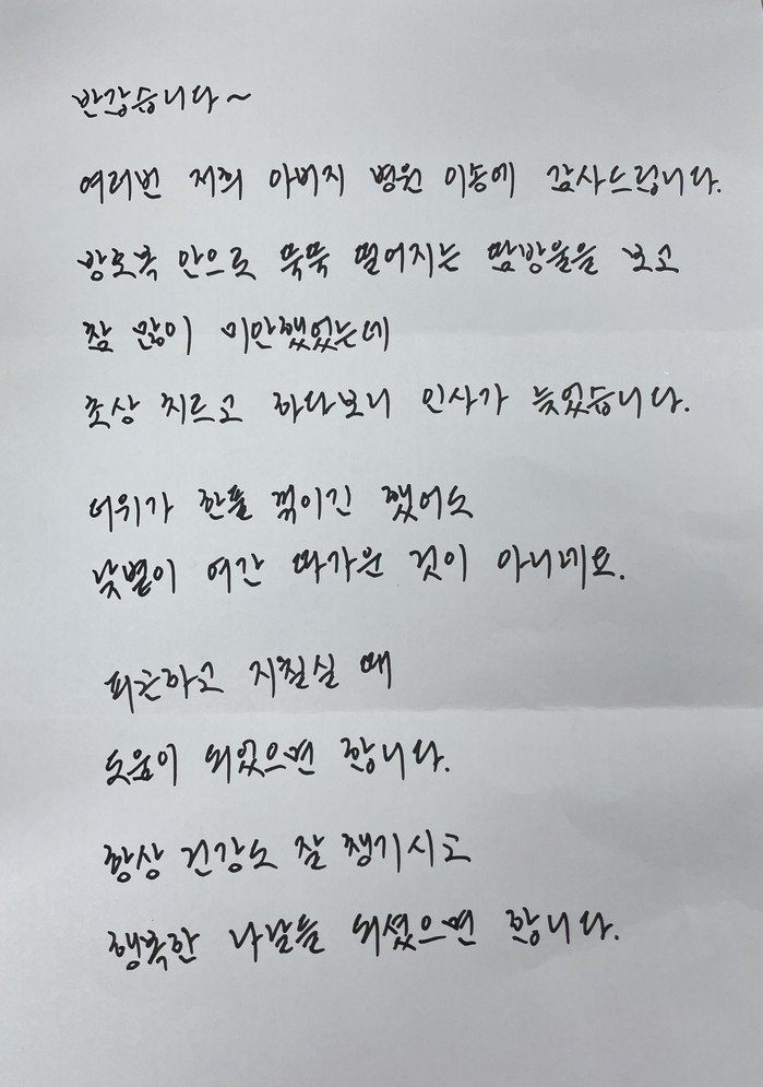 여러 번 구급차를 이용했다고 밝힌 수혜자는 코로나로 감염방지보호복까지 착용하고 땀을 흘리면서 현장활동을 하는 구급대원을 보고 미안했었다면서 항상 건강하시고 행복한 나날이 되었으면 좋겠다는 마음을 전했다.