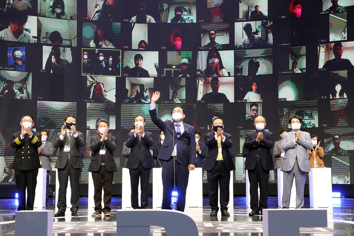 ▲허성무 창원시장이 온라인 방위산업전 폐막식 참가자들에게 손을 흔들고 있다.(창원시 제공) |