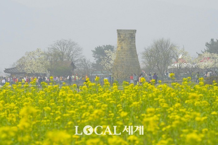 ▲경주 첨성대 주변에 유채꽃, 벚꽃, 백목련이 활짝 피어있다. |