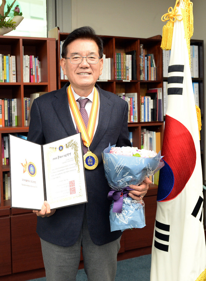 ▲‘2018 대한민국 소비자 대상’에서 올해의 최고 행정 부문 대상을 받은 유덕열 동대문구청장.(동대문구 제공) |