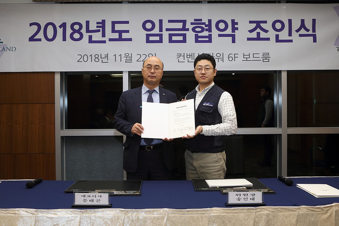 ▲지난 22일 하이원 그랜드호텔에서 ‘2018년 임금교섭 합의 조인식’이 열린 가운데 문태곤 강원랜드 대표(왼쪽)와 송인태 노조위원장이 기념촬영을 하고 있다.(강원랜드 제공) |