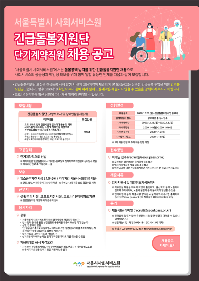 [로컬세계 이명호 기자]서울시사회서비스원이 자가격리생활시설, 코호트(동일집단)격리시설, 확진자 치료병원에 파견되어 ‘코로나19 확진자 발생 여파로 돌봄 공백에 놓인 어르신 및 장애인’을 돌볼 긴급돌봄인력을 모집한다.