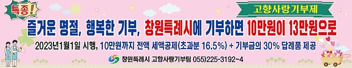 [로컬세계=정판주 기자] 경남 창원특례시는 ‘고향사랑기부제’ 시행에 따라 출향민의 자발적 기부문화 활성화를 위해 다방면, 전방위 홍보를 실시해 명절을 맞아 고향을 찾는 방문객에게 제도를 알리기 위하여 발 벗고 나섰다고 18일 밝혔다.
