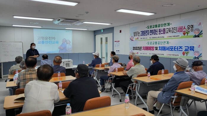 ▲지난 23일 만 75세 이상 운전면허 갱신기간이 도래한 고령운전자를 대상으로 ‘찾아가는 고령운전자 면허갱신 원스톱(검진·교육) 서비스’ 교육 모습. 의성군 제공 |