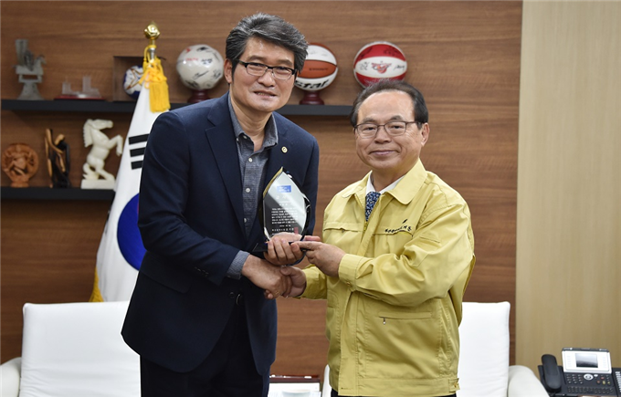 | ▲유기옥 한돈 경남도협의회 회장에 감사패 전하는 오거돈 부산시장. |
