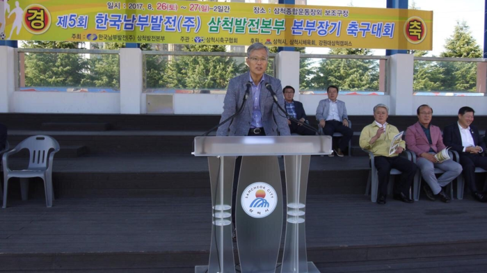▲지난 26일 개회식에서 안관식 한국남부발전(주) 삼척발전본부 본부장이 인사말을 하고 있다.(사진제공= 삼척시축구협회) |