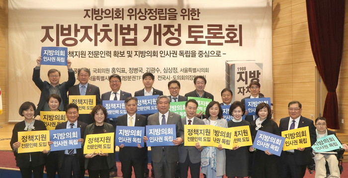 송 의장은 이날 축사를 통해 “지난달 29일 지방자치법 전부개정안이 국무회의를 통과했다는 소식에 17개 광역의회 의장이 모여 웃기도 했지만 울기도 했다”며 “30년 만에 정부에서 국회로 개정안이 넘어간 지금 고민이 깊다”고 말했다.